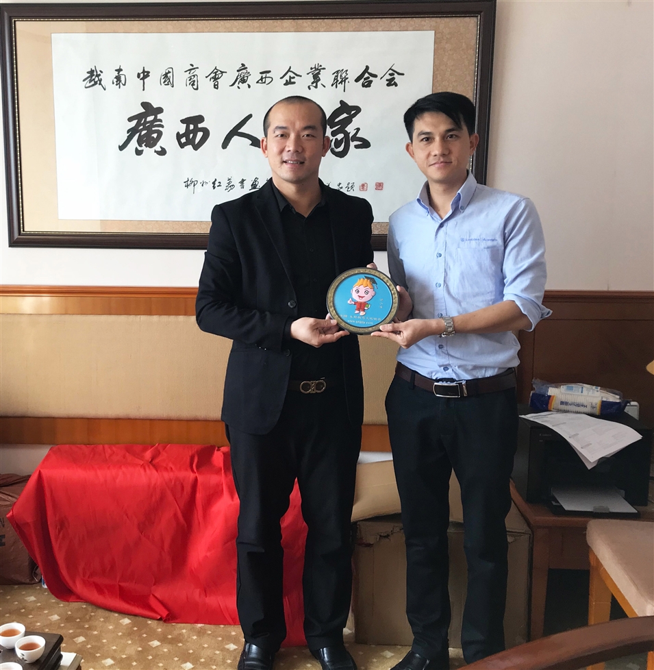 廣西金沛教育執(zhí)行董事粟宥朝(左一)拜訪越南工商總會副主席黃光防(右一)并贈送吉祥物“金小沛”