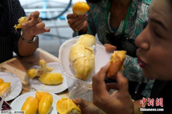 展銷部分邀請了來自泰國50個府的農(nóng)民銷售榴蓮、芒果、紅毛丹等熱帶水果和榴蓮比薩等制品。