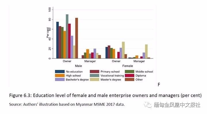 圖說(shuō):中小企業(yè)管理人員受教育水平及性別(來(lái)源:2017緬甸中小企業(yè)環(huán)境調(diào)查)。
