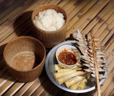 老撾人將洗凈、浸泡過的大米、糯米或紫米加些魚肉,有時加入椰子汁或椰蓉,混合后裝入竹筒內(nèi),并用芭蕉葉封口,放在炭火上以小火烘烤至竹筒焦黑,飯便熟了。