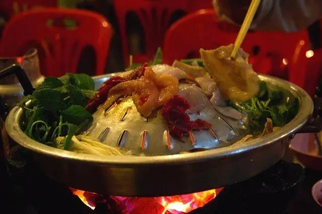 老式火鍋為涮烤兩吃,跟中式火鍋還是有很大區(qū)別的。火鍋的形狀更像一個有沿兒的平底鍋,中間高高鼓起,可用于燒烤,周圍盛湯用于涮煮,還有大廚現(xiàn)場烤制的大蝦、生蠔、牛肉串等食物,配上一瓶老撾啤酒,盡享美食。
