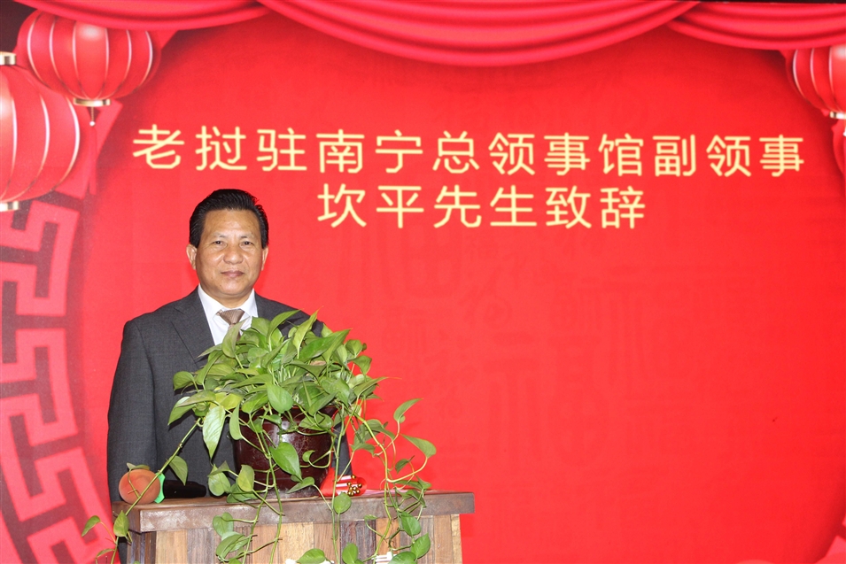 圖為老撾駐南寧總領(lǐng)事館副領(lǐng)事坎平·蘇立亞翁先生致辭