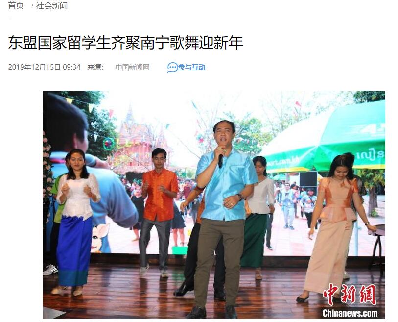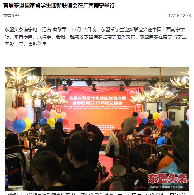 12月14日,由廣西金沛教育主辦的“首屆東盟留學(xué)生迎新聯(lián)誼會暨金沛教育2019年終總結(jié)會”在南寧舉行,此次聯(lián)誼會分兩個部分組成,下午,金沛教育帶領(lǐng)東盟留學(xué)生游覽南寧青秀山風(fēng)景區(qū),參觀東盟友誼長廊,在大草坪進行互動游戲交流,晚上,東盟各國駐南寧使館外交官和東盟留學(xué)生一起歡聚一堂,載歌載舞。