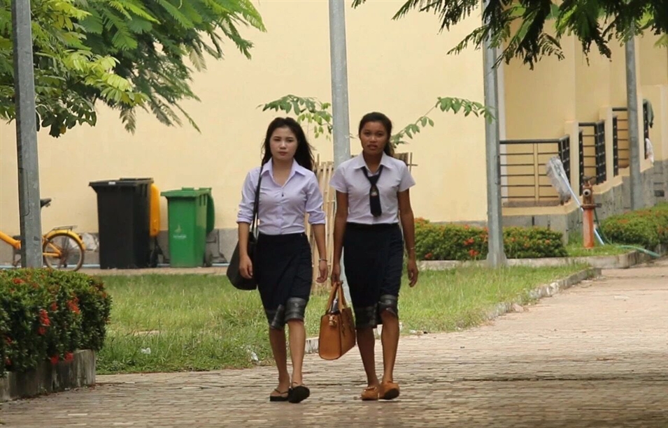 郁郁蔥蔥的東南亞特色的植被中,紅白相間的老撾語(yǔ)教學(xué)樓十分醒目,跳躍在金色陽(yáng)光下的東南亞特色建筑教室,顯得干凈整潔。