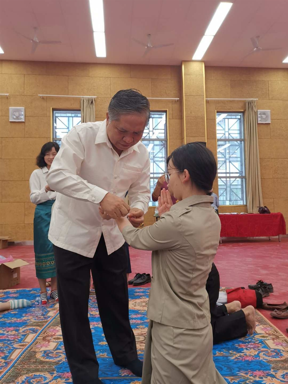 (老撾國(guó)立大學(xué)校長(zhǎng)宋西.諾潘塞在給老師栓線祝福