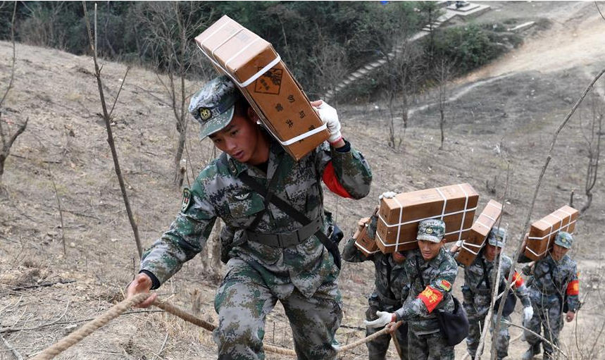 掃雷官兵在中越邊境廣西段某雷場(chǎng)搬運(yùn)炸藥,準(zhǔn)備爆破作業(yè)(12月22日攝)。掃雷官兵在作業(yè)前要對(duì)雷區(qū)進(jìn)行爆破作業(yè),清除雷場(chǎng)植被,方便后期搜排。